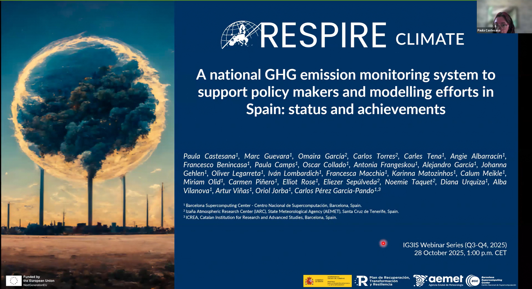 El sistema nacional de monitorización de gases de efecto invernadero (GEI) de España, desarrollado en el marco de RESPIRE-CLIMA, ha sido protagonista de la serie de seminarios del Sistema Integrado de Información sobre Gases de Efecto Invernadero a Escala Global (en inglés Integrated Global Greenhouse Gas Information System, IG3IS). La sesión, titulada “Un sistema nacional de seguimiento de las emisiones de gases de efecto invernadero para apoyar a los responsables políticos y los esfuerzos de modelización en España: situación actual y logros”, tuvo lugar el 28 de octubre. El evento contó con las presentaciones de Paula Castesana, investigadora y coordinadora interna de RESPIRE-CLIMA en el Barcelona Supercomputing Center – Centro Nacional de Supercomputación (BSC-CNS), y Carlos Torres, director del Centro de Investigación Atmosférica de Izaña de la Agencia Estatal de Meteorología (AEMET).